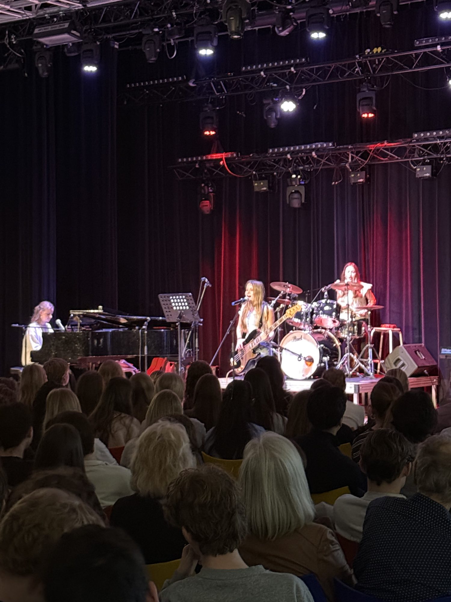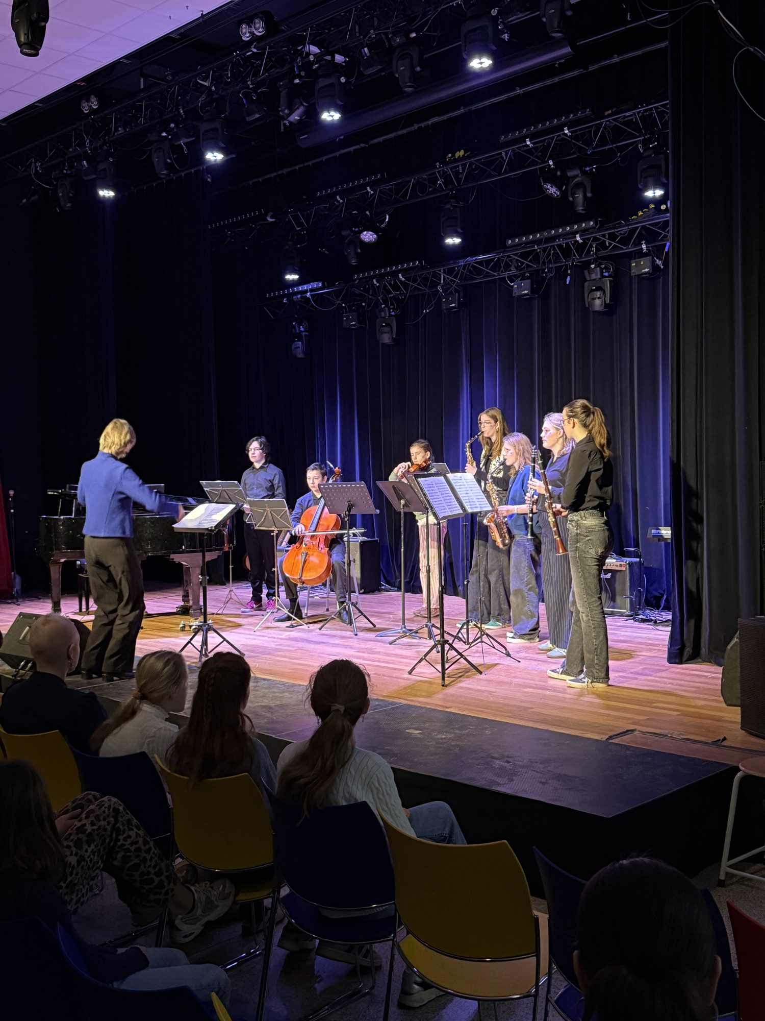 Het schoolorkest met Nova van Eunen, Imke Hellweg, Lyanne Faber, Nora Hellweg, Felix Albracht, Anne Keppler, Emrys Brokking, Maya Roelofs en Lutein Edelbroek.